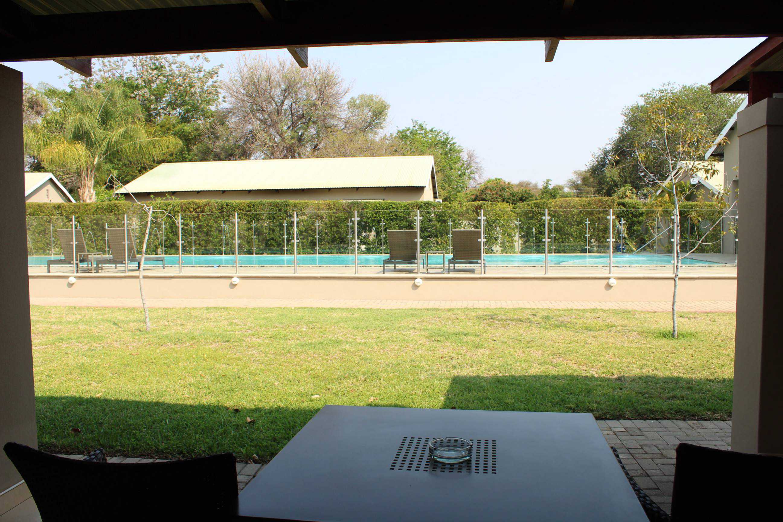 Small veranda with a table and 2 chairs.